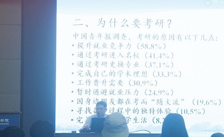 学校研究生院潘宏程老师从“为什么考研?怎样准备考研? ”的提问出发,在考研形势、动机和方法进行考研动员宣讲,详细分析了近几年内考研形势变化,从国家政策,报考与录取流程等进行讲解与辅导,鼓励大家积极报考研究生,并欢迎大家报考本校。