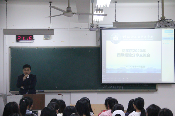 为激发商学院学生对英语学习的热情,进一步提升学生英语四级考试的备考效率,提高学生英语四级通过率,商学院于11月5日晚在雁山校区06206、06408、06402、06404、04621和04109教室顺利举办了商学院2020年四级经验分享交流会。本次分享交流会由邀请了五位优秀学生代表:会计学2019-2班郑雅哲、人力2019-1班徐华欣、营销(应用)2019-2班黄晓婷、会计学2019-1班陆雪琼、人力2019-1班邵轶强进行英语学习经验分享。商学院2020级辅导员敖明明出席本次分享交流会。