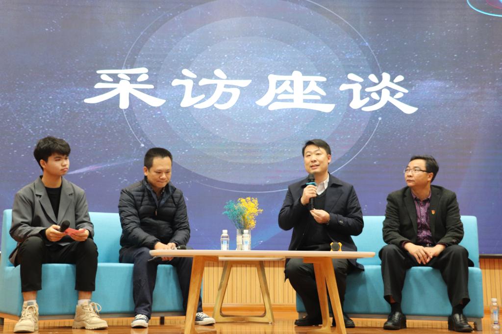专家论坛以采访座谈的形式展开。座谈环节邀请到公共管理与传媒学院常年奋战在双创教育一线的彭正波老师、陆平老师、朱京老师作为访谈嘉宾。三位老师从“大挑”“小挑”“互联网+”三大赛事之间的区别、项目选题如何结合专业特色、如何做好数据分析方面进行了分享。