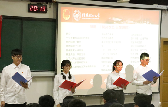 活动在《光荣啊,中国共青团》歌声中拉开了序幕,接着,由学院团委副书记赵思聪老师做题为“勇担时代责任,争做黄文秀式好青年”微团课,之后同学们一起观看了《2019感动中国十大人物》黄文秀片段以及《秀美人生》电影主题MV,并由材料2019创新班的李雪银同学与无机2019-1班的梁玲菊同学发表感想。接下来同学们一起观看了视频《牢记总书记的嘱托》,作为新时代的大学生,我们也应撸起袖子加油干,扑下身子拼命干,牢记总书记的嘱托,坚决打赢脱贫攻坚战,接由蒙文巧,丘声青,熊智萍,江商宁同学带来的朗诵《脱贫攻坚,近在眼前》。本次活动还进行了现场的青年大学习知识竞答,同学都踊跃参与,紧接着由周芳莹同学带来了《科技创新、材料先行》的科创分享,然后由材料2019创新班与无机2019-1班的同学带来合唱《追梦赤子心》与重温入团誓词,活动最后由材料2019创新班班主任张瑞老师进行了总结发言。
