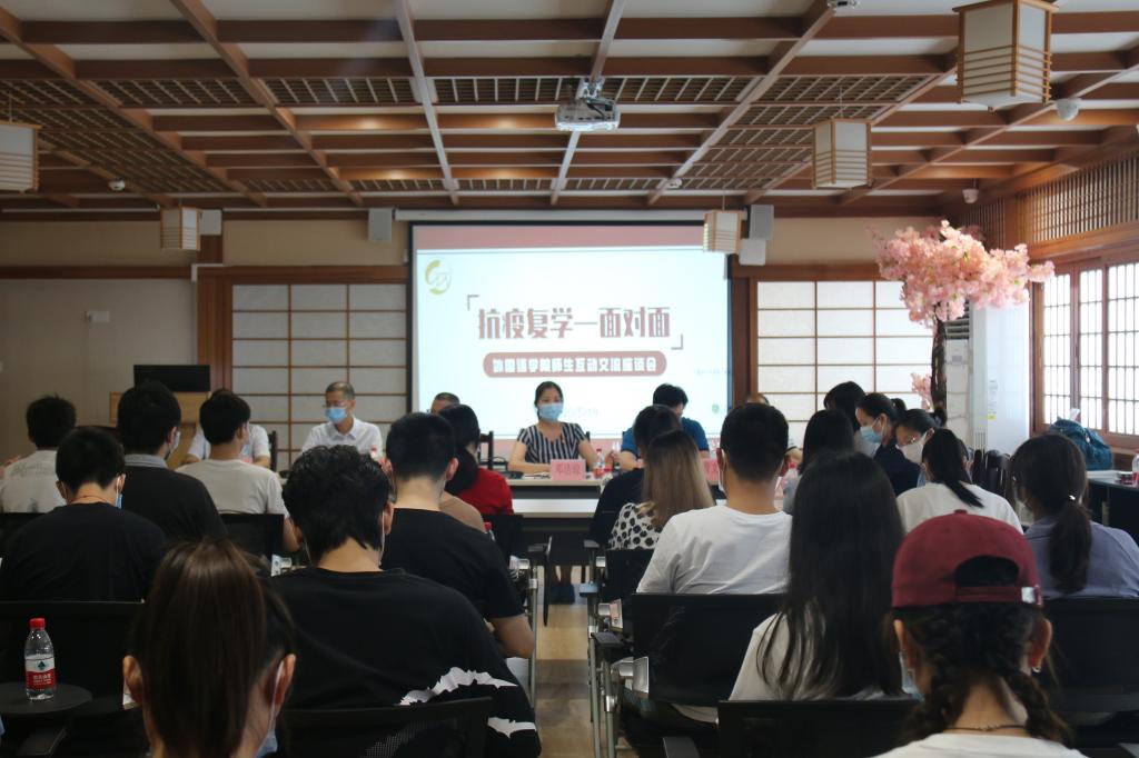 5月19日下午,外国语学院在太阳集团城网站2017雁山校区致远楼日本文化体验馆顺利召开“抗疫复学——面对面”师生互动交流座谈会。学院党委书记谢济光、党委副书记邓洁琼、学院院长唐渠、副院长胡金、朱建斌、李蓉、学院院长助理曾文华、英语教研室主任蒋霞、日语教研室主任邓圆、实验室主任韦祖巧、教学秘书马瑞瑞、19级辅导员陈永梅出席本次会议,学院各班学生代表到场参加,师生共计40余人参与线下交流,700余人观看线上直播。本次会议由18级辅导员梁璇主持。