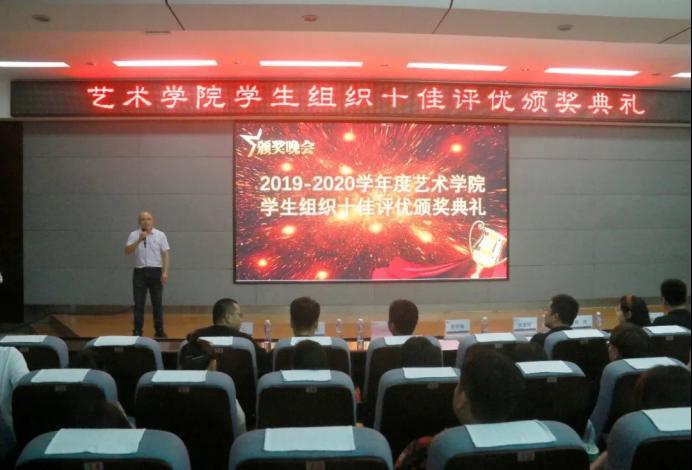 为了更好的推动学院各组织的建设发展,艺术学院于2020年10月13日在雁山校区01501报告厅举行了2019-2020学年艺术学院学生组织先进部门、先进个人颁奖典礼。艺术学院党委副书记苑守瑞、团委副书记(主持工作)2018级辅导员曹权玺、团委副书记(兼职)2019级辅导员徐嘉辉、2017级辅导员魏俊儒、陈丹、2018级辅导员姜鹏昆、2020级辅导员俞仁、各组织成员以及17、18、19级各班学生代表出席了本次典礼。