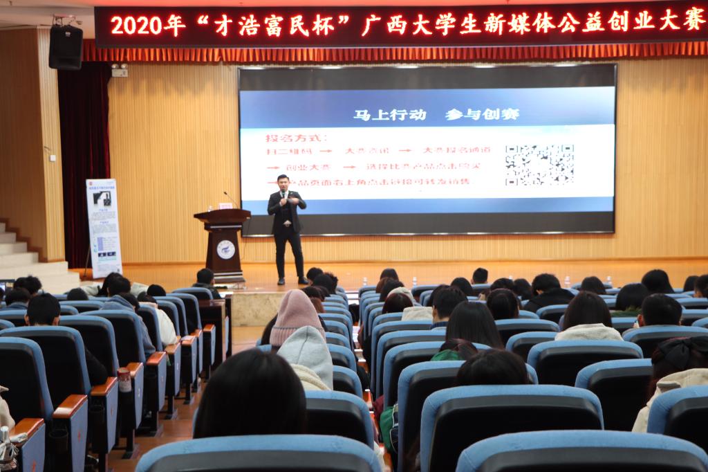 为深入贯彻党的十九大精神和创新驱动发展战略,培养学生创新精神、创业意识和创新创业能力,12月29日上午,2020年“才浩富民杯”广西大学生新媒体公益创业大赛宣讲会在雁山校区图书馆报告厅顺利开展。
