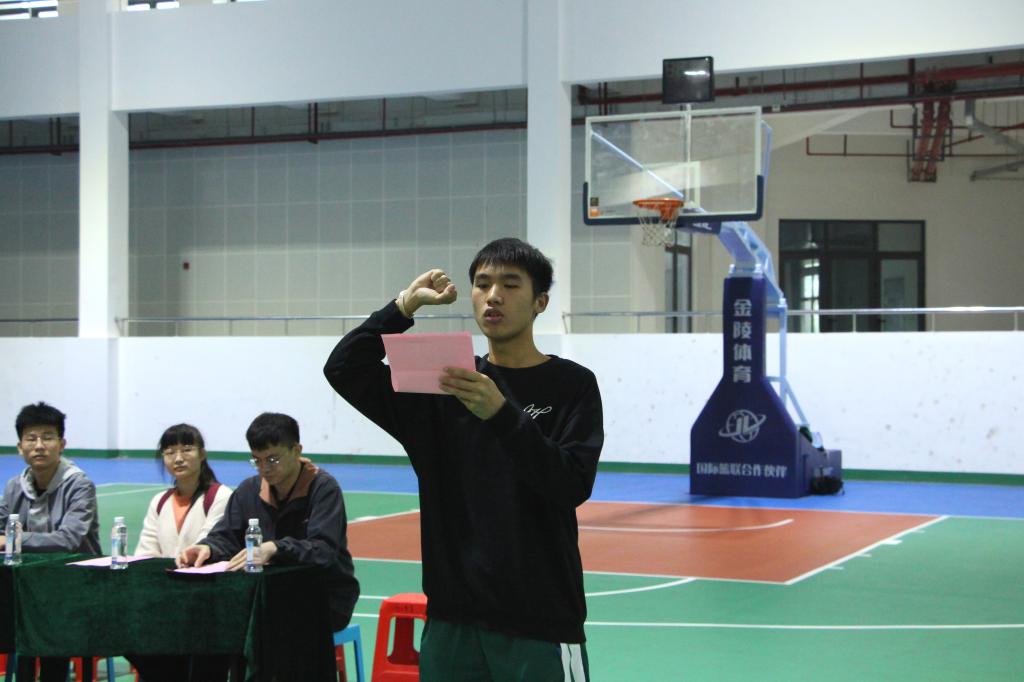 在比赛开幕式上,张伟颀老师表示希望各位球员们能够在篮球场上表现出团结奋斗,顽强拼搏,乐观向上,锐意进取的精神,紧接着球员代表和裁判代表发言。随后主持人宣布“化生杯”篮球赛正式开始。
