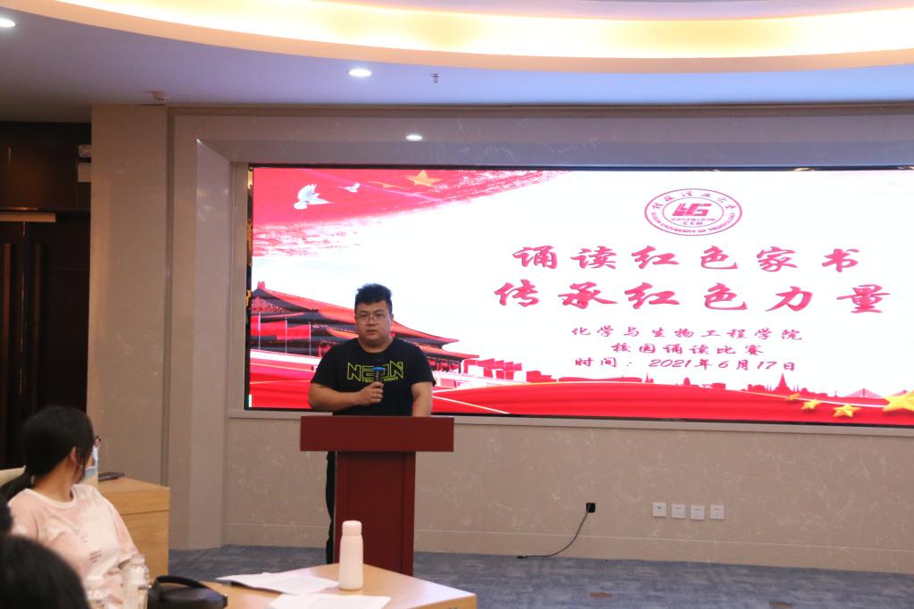 为深入推进党史学习教育,重温光辉历史,弘扬革命精神,传承红色基因,推动广大党员干部真正做到“学史明理、学史增信、学史崇德、学史力行”,6月17日晚上,化学与生物工程学院在雁山15栋15102举办“诵读红色家书,传承红色力量 ”校园诵读比赛,学院团委副书记王凯浩、各年级辅导员、班主任及学院学生会代表、学院青马班学员出席了活动。