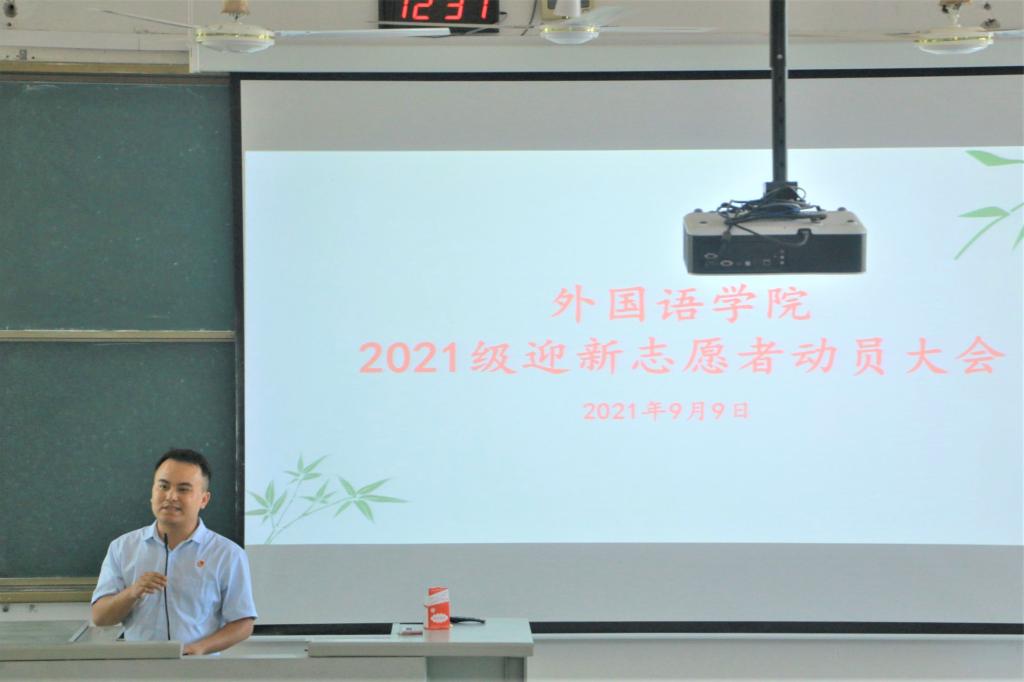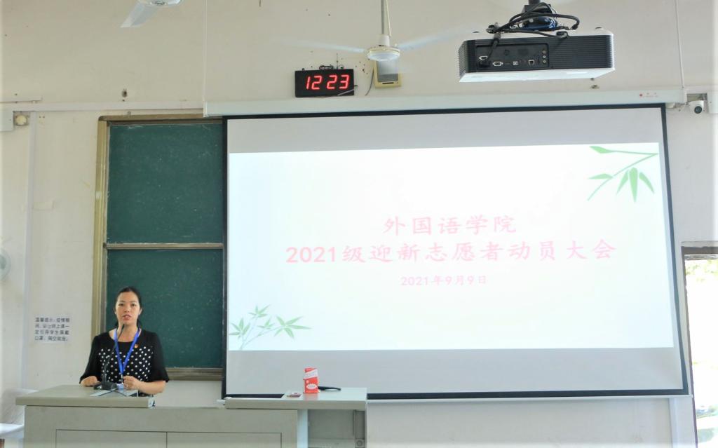9月9日中午,外国语学院在太阳集团城网站2017雁山校区致远楼04110教室顺利举行2021级迎新志愿者动员大会。此次动员大会邀请到外国语学院党委副书记邓洁琼、学院团委副书记兼2021级辅导员黎云鹏、学院团委兼职副书记兼2018级辅导员梁璇、2019级辅导员姚倩、2020级辅导员李林军、王好男出席,外国语学院全体迎新志愿者积极到场参加。