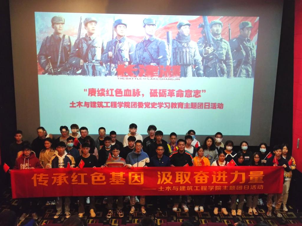 为进一步深入学习习近平总书记在庆祝中国共产党成立100周年大会上的重要讲话精神,切实加强青年学生爱国主义教育,提高青年学生爱国主义热情和对革命先烈的崇敬之情。2021年10月19日,土木与建筑工程学院团委组织开展“传承红色基因,汲取奋进力量”主题团日活动,活动以观看红色革命电影《长津湖》形式开展,学院团委、学生会、团支部学生干部代表共计30余人参加活动。