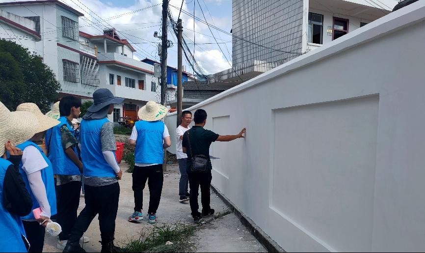 学院团委书记曹权玺与驻村第一书记徐嘉辉交流指导墙绘开展的具体事宜