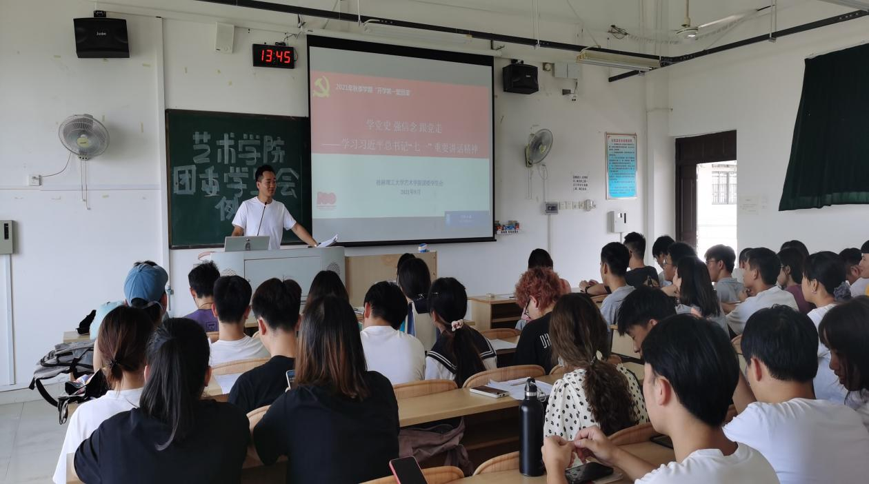 为深入贯彻习近平总书记“七一”重要讲话精神,推动广大学生学党史、强信念、跟党走,艺术学院团委、学生会于2021年9月7日中午在雁山校区05608教室开展了2021年秋季学期“开学第一堂团课”。团课由艺术学院团委书记曹权玺主讲,团委、学生会全体成员参与学习。