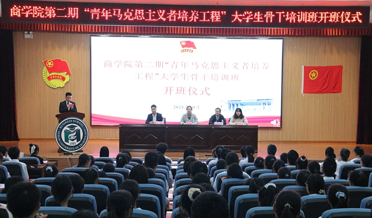 为深入学习宣传贯彻习近平新时代中国特色社会主义思想,提高商学院2021级团学骨干的理论水平和业务能力,推进商学院基层团学组织建设,10月23日上午,商学院在雁山校区图书馆报告厅举行第二期“青年马克思主义者培养工程”大学生骨干培训班开班仪式。商学院党委副书记沈菲菲,团委书记宋海民,2021级辅导员王贤、黄佳玲出席本次开班仪式,商学院团委、学生会、励合社、易班学生工作站暨传媒中心、学生社区管理服务中心成员以及全体2021级团支书班长参加开班仪式。开班仪式由商学院学生团委副书记程俊杰主持。