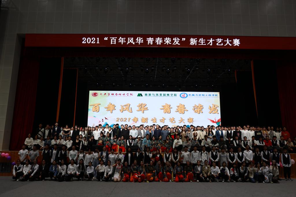 为庆祝党的百年华诞,展示青春的蓬勃朝气,公共管理与传媒学院和旅游与风景园林学院、机械与控制工程学院在11月5日晚于雁山校区新体育馆共同举办主题为“百年风华,青春荣发”的新生才艺大赛。 管媒学院党委副书记杨晓、团委副书记(兼)莫田娟、2021级辅导员朱晓出席本次比赛并担任评委。