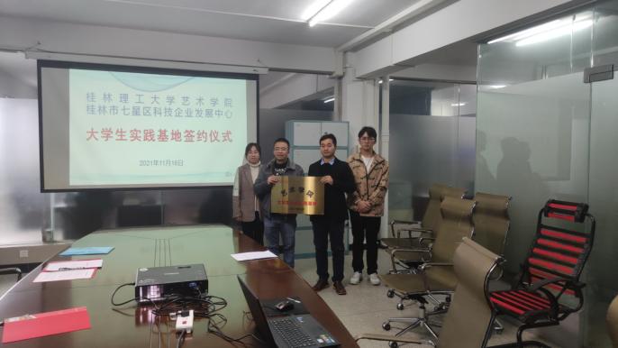 为加强艺术学院学生实践能力,培养学生综合素质,2021年11月16日,艺术学院“大学生社会实践基地”签约授牌仪式于桂林市七星区科技企业发展中心举行。参加本次授牌的有桂林市七星区科技企业发展中心办公室主任张捷,艺术学院团委书记曹权玺老师,以及艺术学院团委、学生会的主要学生干部。