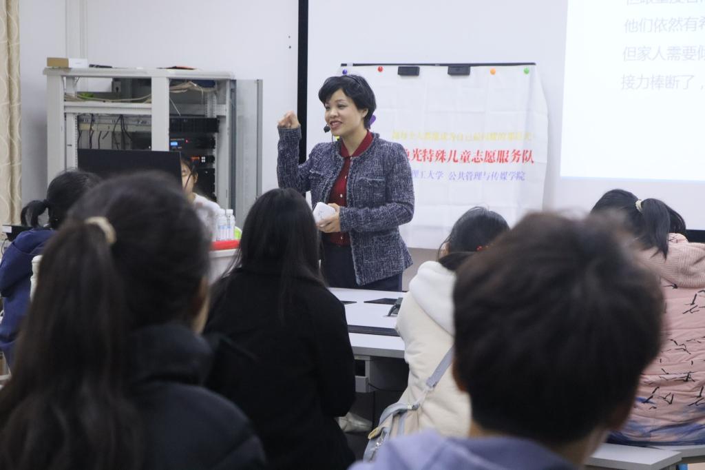 培训正式开始,黄妮娜老师向大家介绍了当前特殊儿童群体的情况,并结合亲身经历和专业知识给大家讲述了与特殊儿童交流互动的技巧。同时,黄老师还结合生动有趣的相关例子提醒来接受培训的同学们:志愿者们要懂得在不同情况下采取不同的应对方法。在培训的过程中,黄妮娜老师也就志愿者们要准备关注什么问题(包括安全问题、志愿者们应该注意如何提升孩子的配合性、如何与孩子建立关系),要提升什么能力(包括重视激发语言能力、重视礼仪和自理能力培养)提出了明确要求。在培训接近尾声时,黄妮娜老师还为同学们解答了他们在心理方面的相关问题的疑惑。