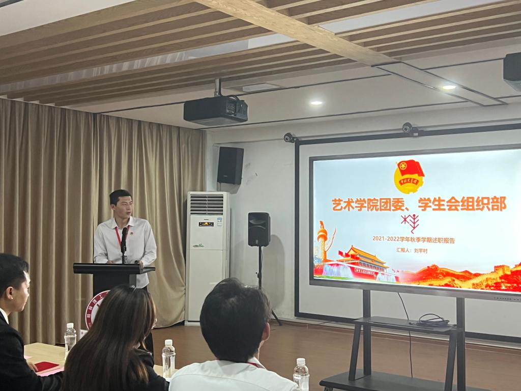 首先,艺术学院团委书记曹权玺老师致词,他代表艺术学院团委向述职的工作人员表示感谢,肯定了2021年艺术学院团委、学生会为学院团学工作的发展作出的贡献,并对2022年艺术学院团委、学生会的工作提出了三点要求:一是学生干部要提高思想认识,把个人成长成才融入到学校、学院各项事业发展中。二是学生干部要加强作风建设,以身作则,时刻牢记为师生服务的宗旨。三是在平时的工作和学习中要学会思考,勇于创新,只有吃得下苦,才能享受成功的甜。随后,艺术学院团委、学生会各部门负责人结合自身部门特点、活动开展情况、不足之处和2022年的工作计划进行了汇报。最后,曹权玺老师对本次述职报告会进行总结。他希望每个部门要形成自身特色,重视每一次总结的机会,吸取经验教训,为我院团学工作的顺利发展建言献策。