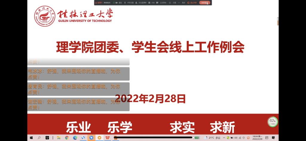 为推进理学院团委、学生会2022年工作顺利开展,更好的服务于老师和同学,2月28日下午,理学院团委、学生会通过钉钉在线平台召开2022年春季学期工作例会,学院团委副书记舒强老师,团委、学生会全体成员参加会议,会议由学院团委副书记舒强老师主持。