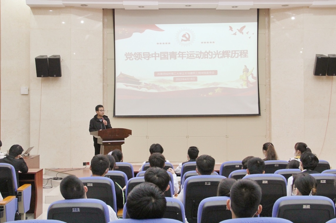 为深入学习宣传贯彻习近平新时代中国特色社会主义思想,营造迎接宣传贯彻党的二十大的浓厚氛围,引导团员青年坚定跟党走、奋进新征程,土木与建筑工程学院于4月16日在雁山校区12栋萃华楼报告厅开展“党的青年运动史”主题团课,团课由学校青年讲师团讲师、学院团委副书记(兼)安邦国老师主讲,学院团委、学生会全体成员参加专题团课学习。