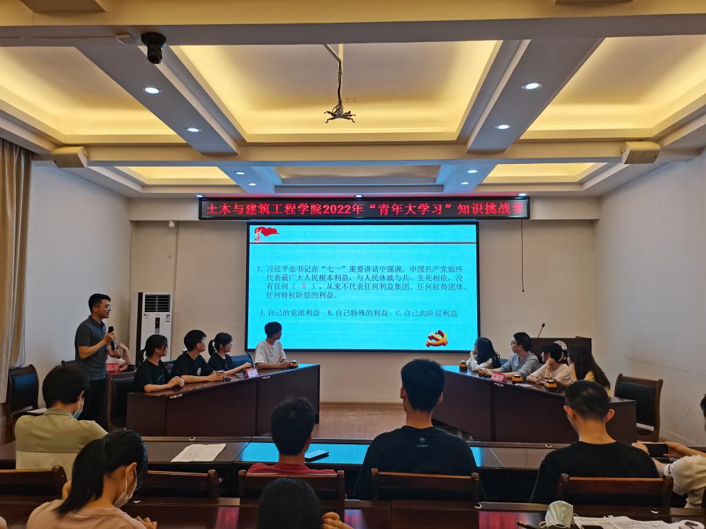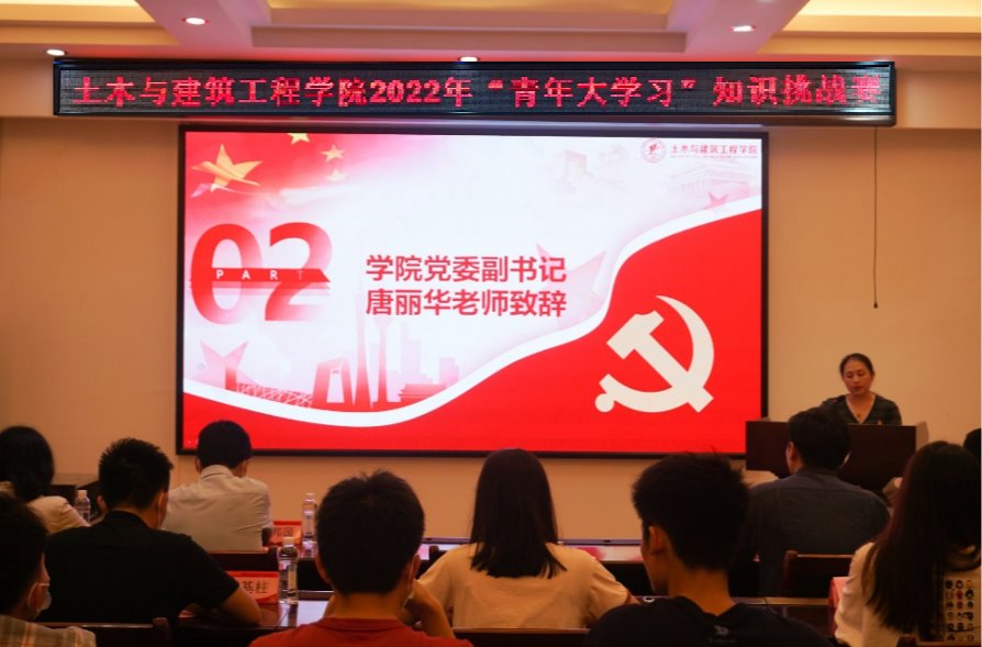 为深入贯彻落实习近平新时代中国特色社会主义思想,深化党史学习教育成果,激发广大同学参加“青年大学习”的热情,4月25日晚,土木与建筑工程学院“喜迎二十大、永远跟党走、奋进新征程”2022年“青年大学习”知识挑战赛在屏风校区4204会议室举行,学院党委副书记唐丽华、各年级辅导员出席该活动。