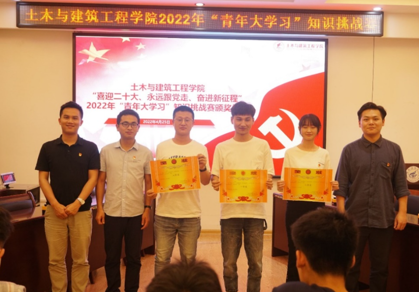 经过激烈角逐,土木与建筑工程学院本科生第二党支部代表队荣获一等奖,研究生第五党支部代表队、研究生第六党支部代表队和本科生第四党支部代表队荣获二等奖,本科生第一党支部代表队、本科生第三党支部代表队、本科生第五党支部代表队和研究生第四党支部代表队荣获三等奖,并由安邦国老师、司富远老师、谢基柱老师为获奖团队代表颁奖。