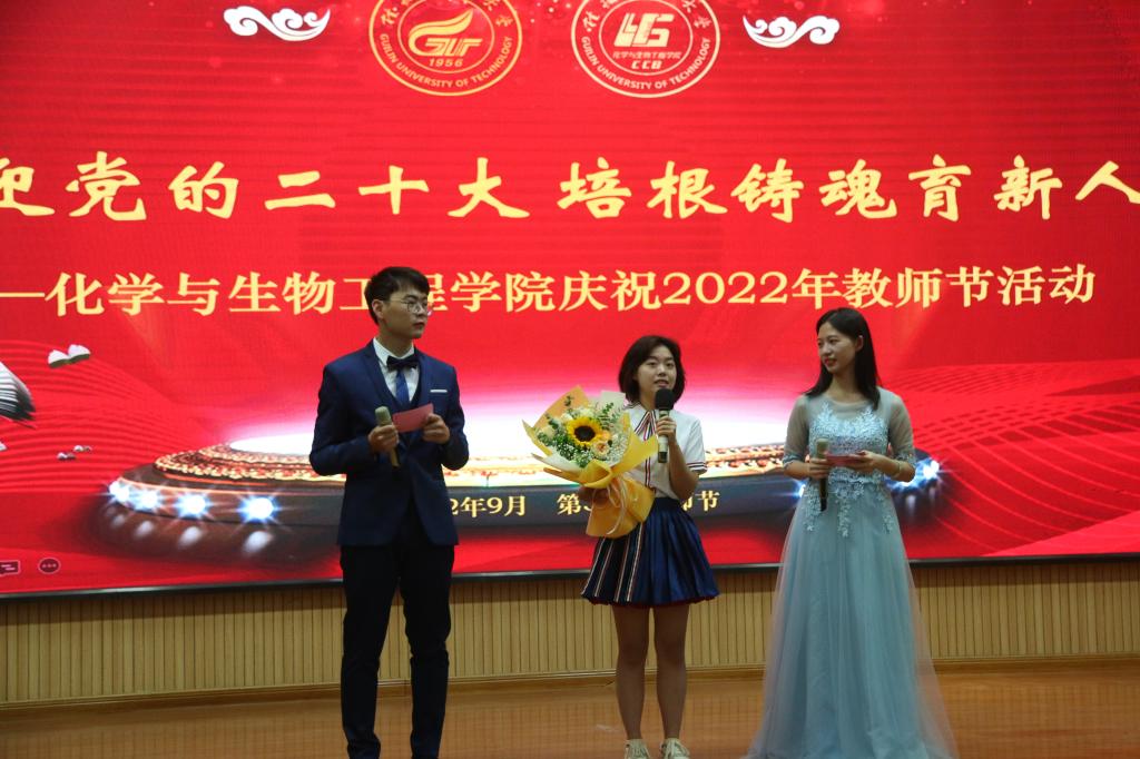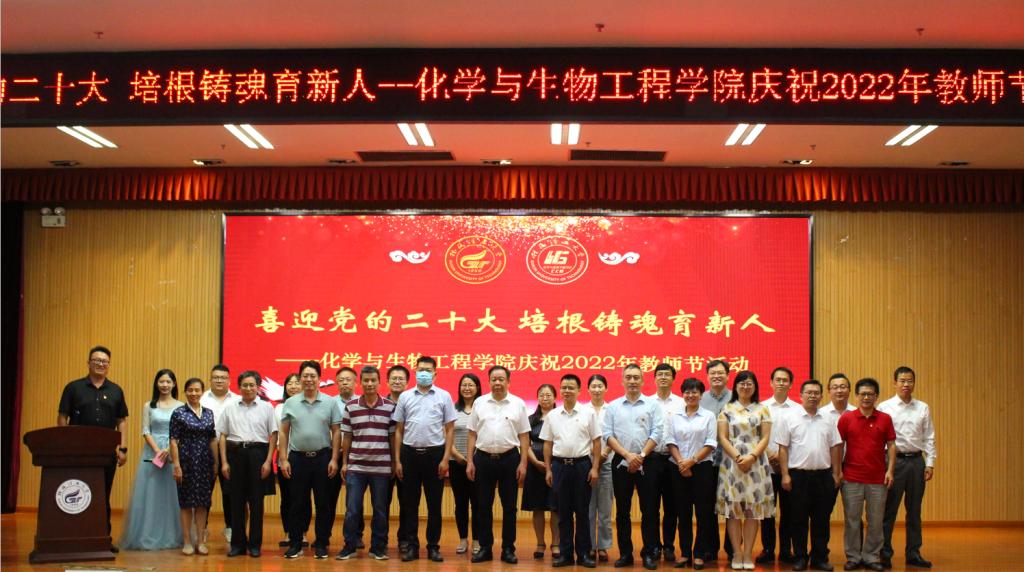 为深入贯彻落实党的十九大和十九届历次全会精神以及习近平总书记太阳集团城网站2017教育系列重要论述精神,进一步增强广大教师和教育工作者的光荣感和使命感,化学与生物工程学院以迎接党的二十大为契机,结合第38个教师节的到来,于9月9日下午在雁山校区图书馆报告厅开展以“喜迎党的二十大,培根铸魂育新人”为主题的教师节庆祝活动。学校党委常委、副校长梁福沛、化学与生物工程学院党委书记彭代江、院长匡小军以及学院全体教师、学生代表等220余人参加了本次活动。