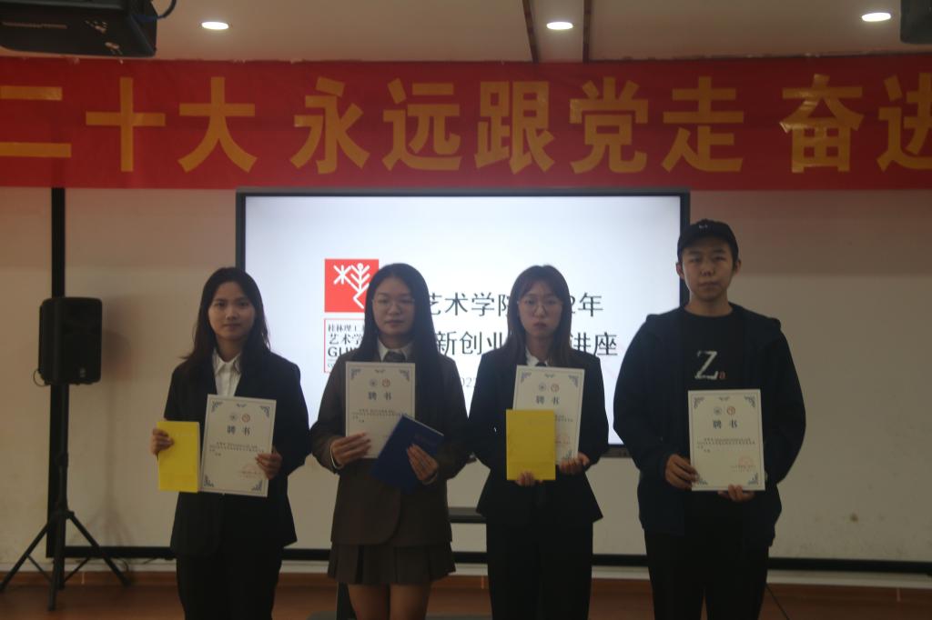 本次讲座邀请了艺术学院团委书记曹权玺老师来进行观看并致辞,并邀请了商学院韦丽艳、赖嘉欣、艺术学院钟婷以及测绘学院岳韦霆,为在座人员分享他们的创新创业经验和心得体会。