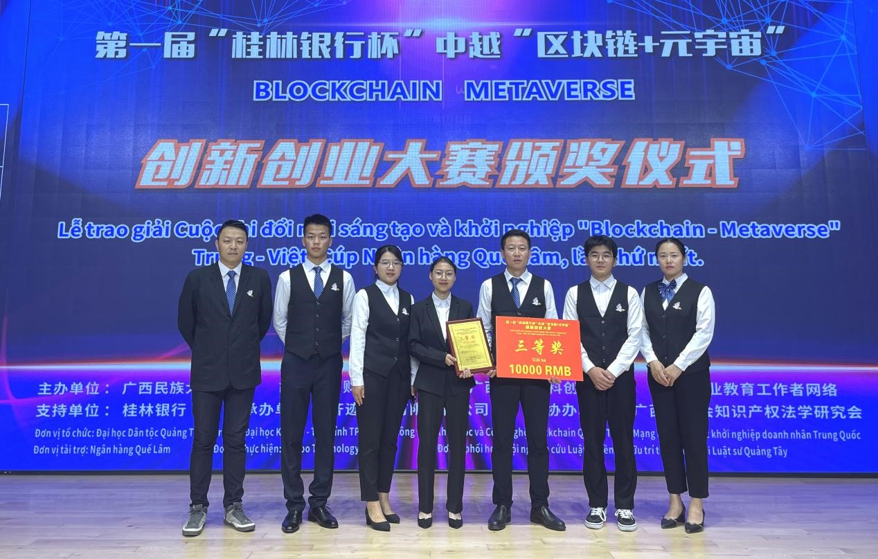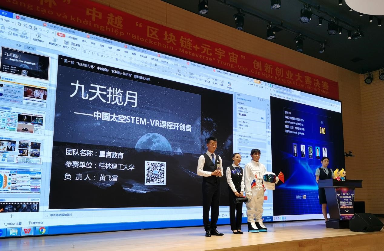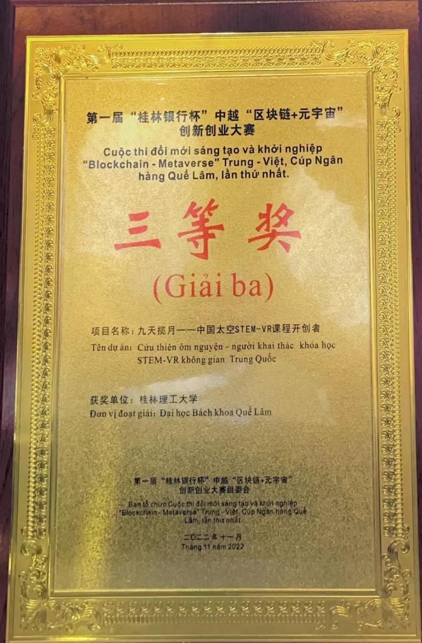 近期,由广西民族大学、胡志明市财经大学、广西区块链科创园以及中国创业教育工作者网络(EECN)共同举办、桂林银行冠名支持的第一届“桂林银行杯”中越“区块链+元宇宙”创新创业大赛决赛及颁奖典礼在广西民族大学以线上线下相结合的方式召开。太阳集团城网站2017太阳集团城网站2017参赛项目《九天揽月——中国太空STEM-VR课程开创者》荣获大赛三等奖。