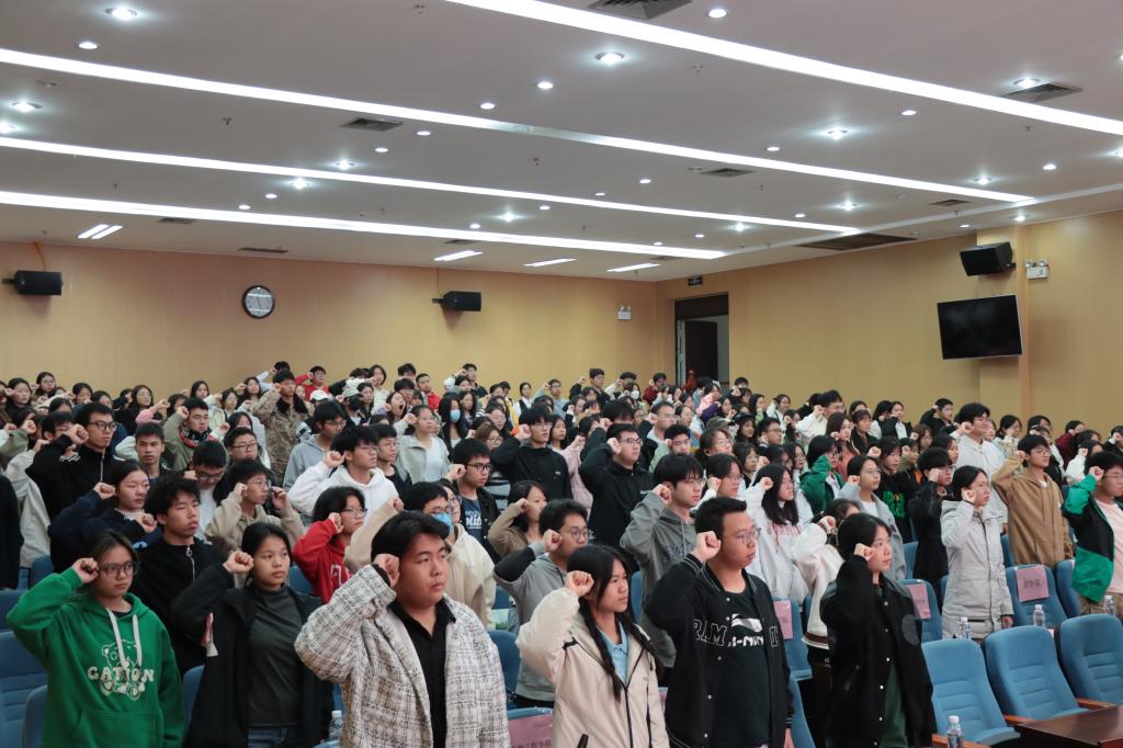 团日活动在共青团团歌声中拉开序幕。本次主题团日活动精彩纷呈,包括观看学习视频、团员青年领学、分享学习感悟、朗诵《我爱你,中国》、知识竞答、重温入团誓词等环节。在活动中,理学院李文艺同学进行领学《习近平总书记的“青年观”》,勉励团员青年,我们要牢记习近平总书记的殷殷嘱托,坚定理想信念,做伟大思想的学思践悟者;胸怀“国之大者”,做人民至上的担当落实者;勇于攻坚克难,做中国式现代化的开拓创新者。校团委余东东老师上台进行总结发言。她指出:本次示范性团日活动是对2023级班长、团支书举办班级团日活动的优秀示范,它展现了活动内容的丰富性、形式的多样性,并始终紧密围绕主题。希望同学们在未来的学习与工作中,能够持续坚持读原著学原文悟原理,不断提升自身的思想觉悟和理论素养,能够发扬“自找苦吃”的精神,不断在实践中磨炼意志、增长才干,争做有理想、敢担当、能吃苦、肯奋斗的新时代好青年。