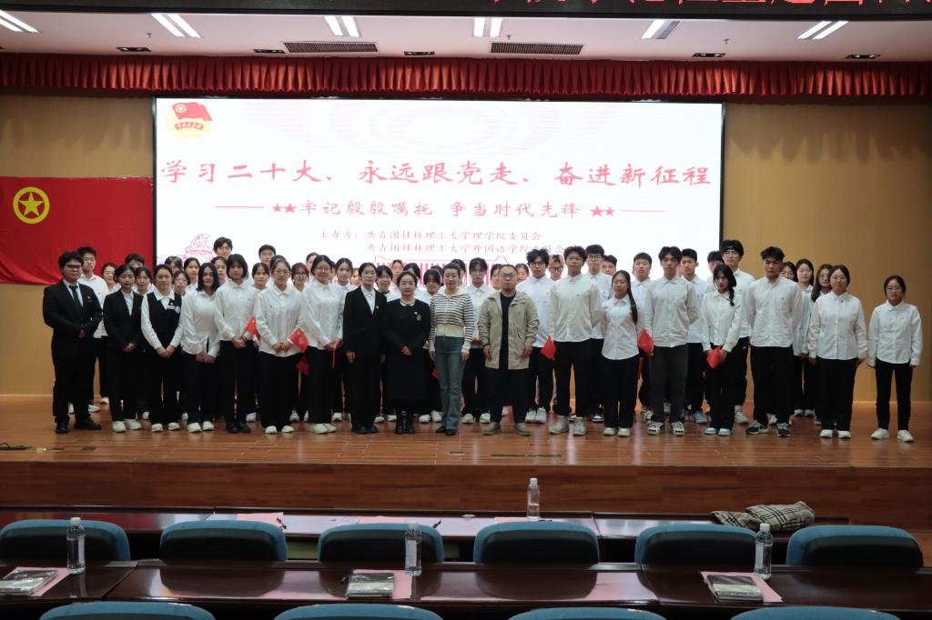 为深入学习贯彻习近平新时代中国特色社会主义思想和党的二十大精神,引导广大团员青年牢记领袖嘱托,不负殷切期望,激励引导广大团员青年坚定听党话、跟党走的理想信念,11月12日上午,外国语学院和理学院在雁山校区图书馆报告厅联合举办了“学习二十大、永远跟党走、奋进新征程——牢记殷殷嘱托,争当时代先锋”示范性主题团日活动。校团委组宣部副部长余东东老师、理学院团委副书记彭娇娇老师、外国语学院2020级辅导员王好男老师,以及各学院团委组织部负责人、新生班长、团支书和团员青年代表参加本次活动。