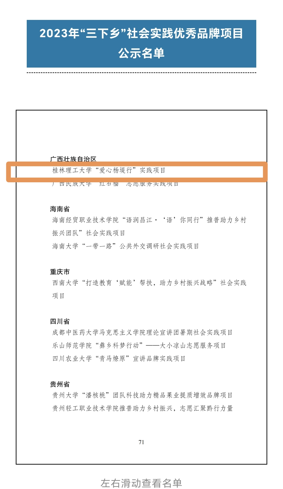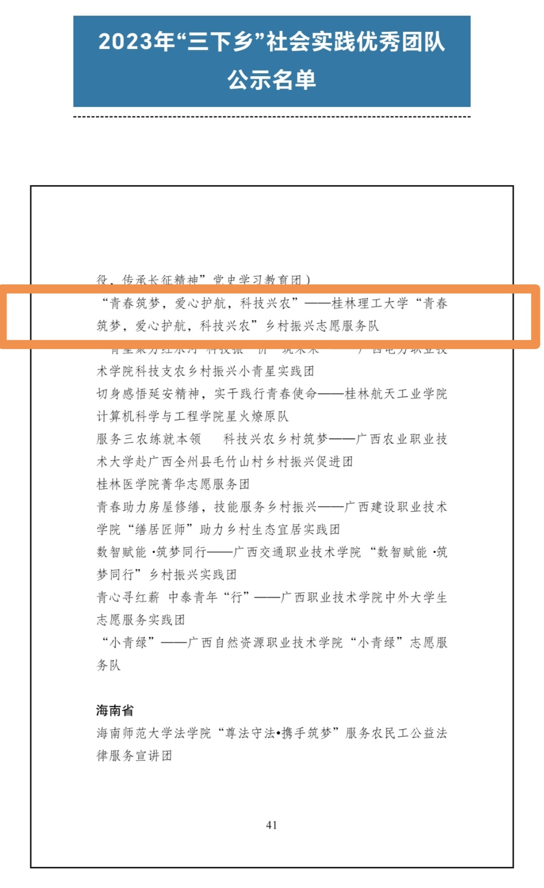 2023年,学院全国大学生暑期社会实践活动专项行动获批情况实现历史,2支社会实践团队成功入选国家级社会实践项目。“薪火传承”44118太阳成城集团团队入选2023年“圆梦工程”服务农村未成年人传承优秀传统文化44118太阳成城集团项目;“青春筑梦,爱心护航,科技兴农”乡村振兴44118太阳成城集团队获批2023年全国大中专学生“三下乡”社会实践活动之乡村振兴“笃行计划”专项行动全国示范性团队,同时学院积极开展“返家乡”社会实践专项活动,近500名大学生返回家乡原地开展各项社会实践活动和44118太阳成城集团活动,平均44118太阳成城集团长达50小时以上,圆满完成各项活动任务。今年暑期社会实践活动中,校院级以上重点团队数量2个,校院级以上团队参与人数达到了700余人。暑期“三下乡”社会实践活动开展期间,学院微信公众号及时发布活动简讯,以图文并茂的形式宣传活动开展情况,扩大了社会实践活动的社会影响力,引来社会各界和新闻媒体的广泛关注,央视网、人民网、中国网、中国青年网、广西学联等公众平台相继进行了近30篇专题报道。