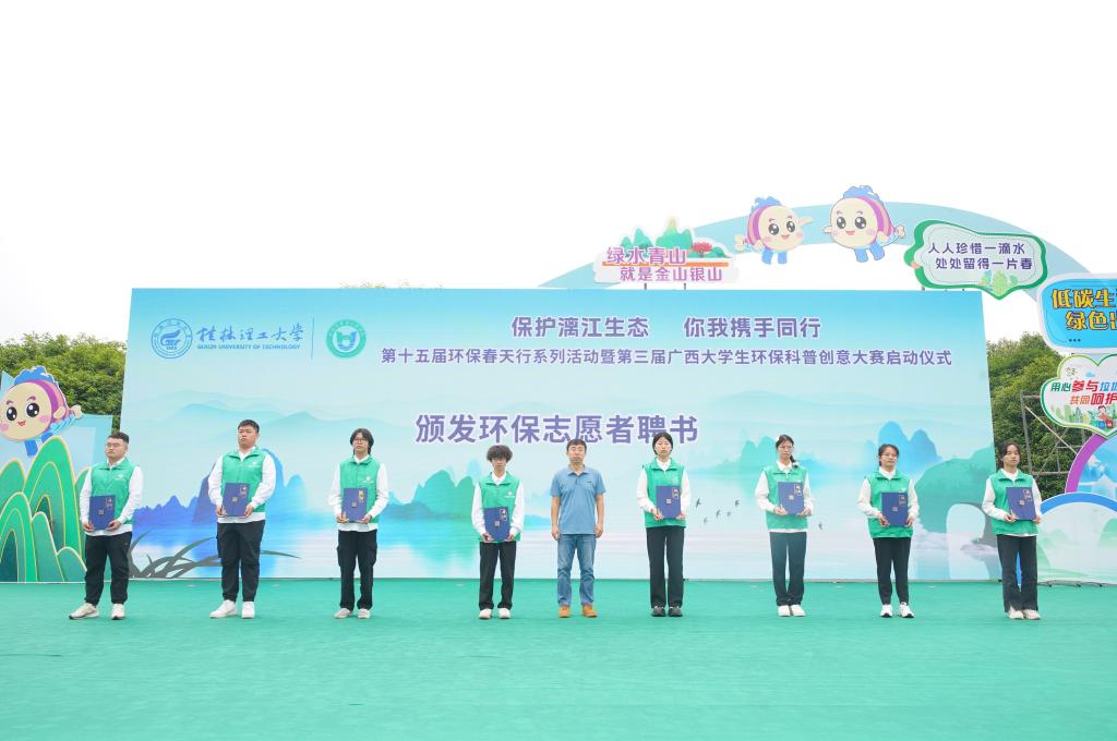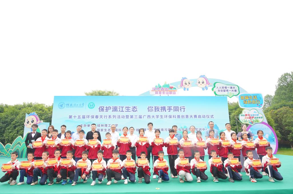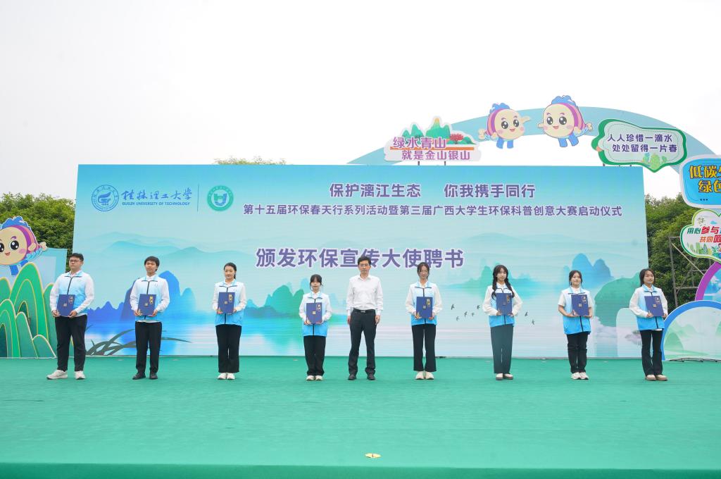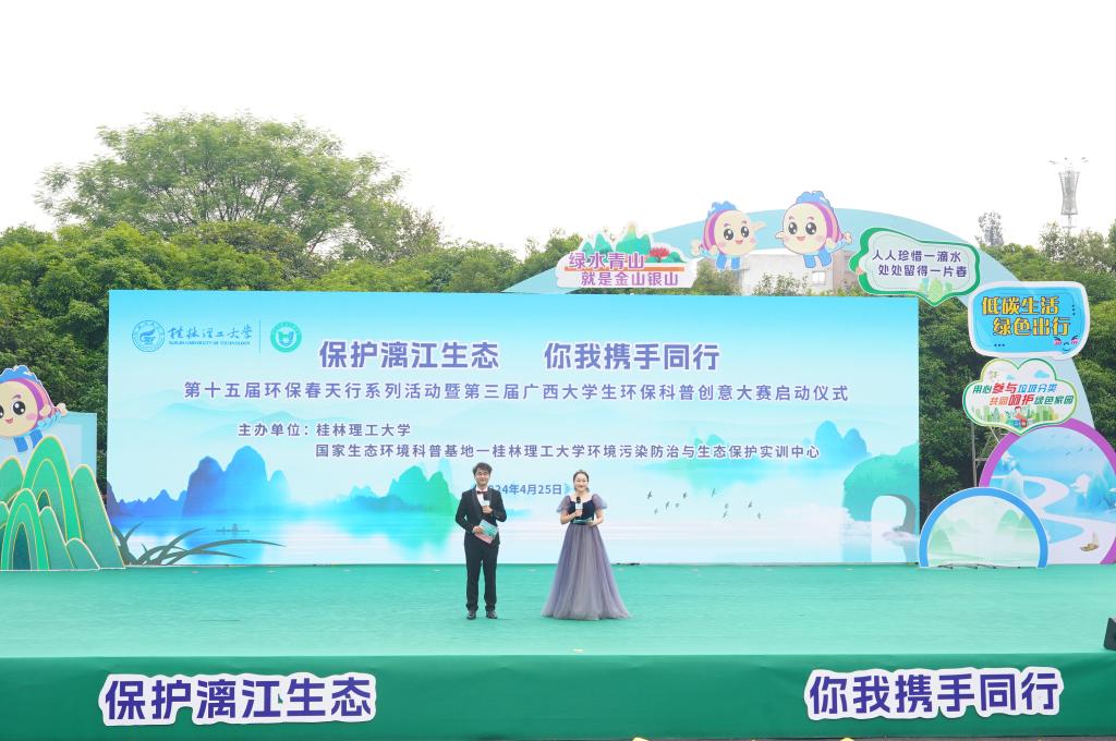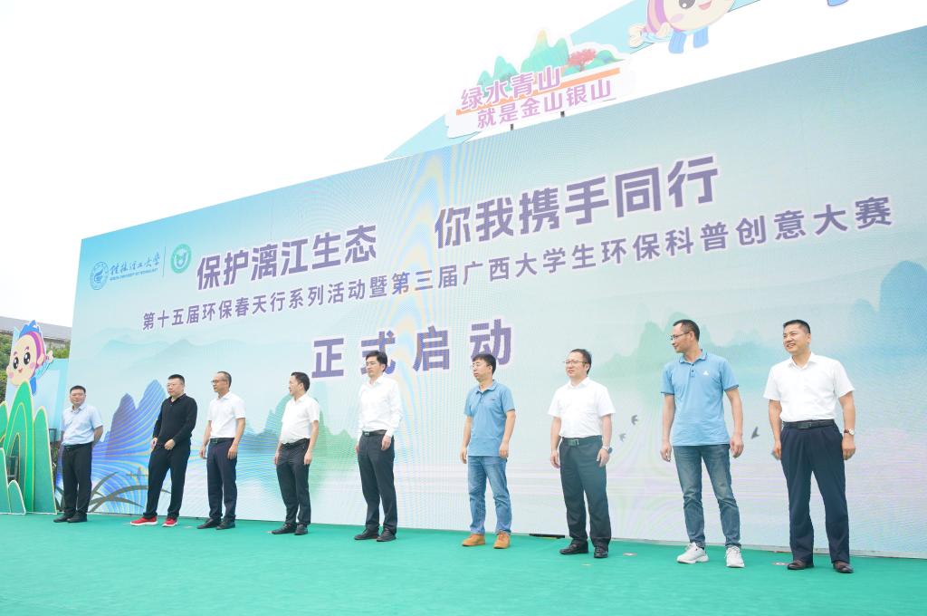 4月25日上午,在第三个桂林市“漓江保护日”到来之际,为深入贯彻落实习近平生态文明思想,提升广大青年学生环保意识,展现当代青年的环保担当与青春风采,由学校和国家生态环境科普基地—太阳集团城网站2017环境污染防治与生态保护实训中心主办的“保护漓江生态,你我携手同行”第十五届环保春天行系列活动暨第三届广西大学生环保科普创意大赛启动仪式在雁山校区举行。学校党委常委、副校长王磊出席活动并致辞,党委常委、宣传部部长叶昊,校长助理、党办校办法务办主任张成龙,广西环境科学学会秘书长王晓飞,桂林市生态环境局、兴安县生态环境局有关领导,各兄弟院校相关领导和嘉宾、学校相关职能部门负责人出席活动,广西大学生环保科普创意大赛参赛代表以及桂林市大埠中心校师生代表参加活动。