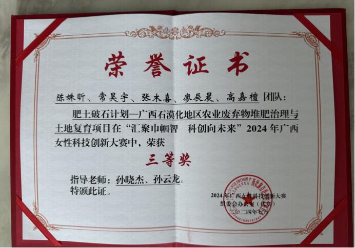 本活动由自治区妇联、自治区人社厅、自治区国资委、自治区总工会、共青团广西区委、自治区科协、广西广播电视台联合主办,现场为一二三等奖、优胜奖等获奖项目颁奖,经过激烈的角逐、层层比拼,环院学子以卓越的表现荣获了三等奖。该团队在比赛中展示了对现实挑战的深刻洞察,对创新的独到理解以及用科技力量解决实际问题的决心。
