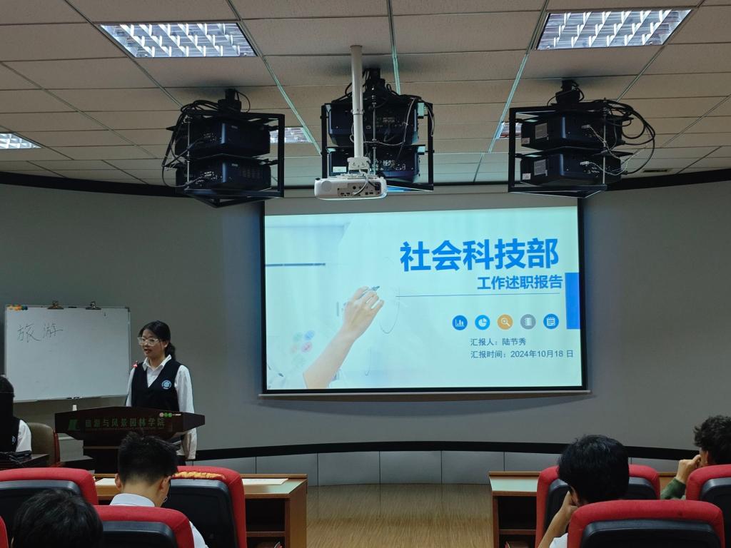 为进一步加强学生骨干队伍的建设和管理,总结团学组织工作成果,提升工作能力,强化服务意识。旅游与风景园林学院团委·学生会于10月18日在04616报告厅召开述职大会。本次大会不仅是对过去一学期工作的总结与回顾,更是对新学期工作的规划与展望。学院团委副书记王成圆老师、团委学生会全体成员以及部分学生代表参加了本次会议,会议由办公室覃彬主持。