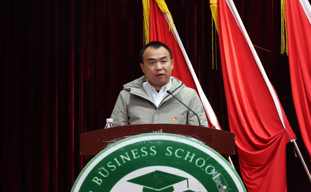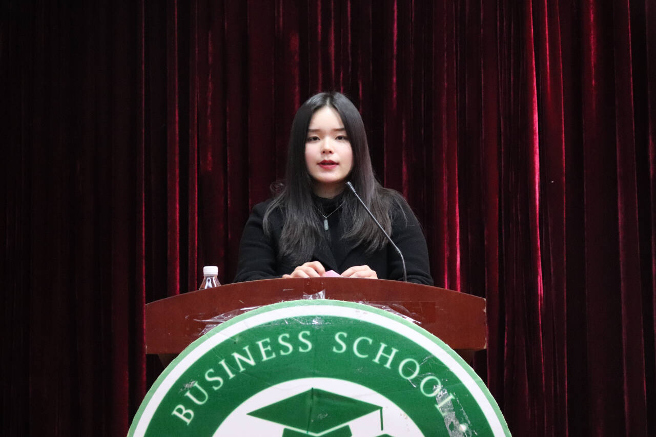 校学生会主席团成员蒋文洁同学谨代表学校学生会向大会的召开表示热烈的祝贺,对商学院各项活动的顺利展开表示衷心祝愿。在讲话中,她表示希望商学院新一届学生会能够在学院党委和上级团委的正确领导下,团结带领商院广大团员青年,踏实苦干,锐意进取,奋力书写商院学子为中国式现代化挺膺担当的青春篇章。