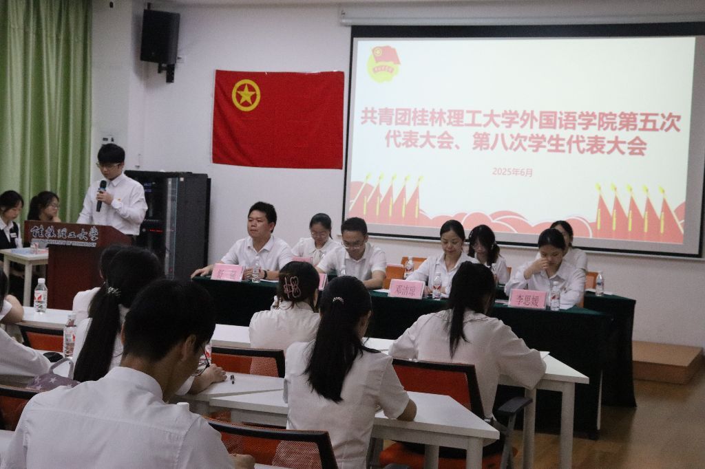 2025年6月27日,共青团太阳集团城网站2017外国语学院第五次团员代表大会、第八次学生代表大会在雁山校区15205会议室顺利召开。创新创业学院专职副院长唐红兵、学院党委副书记邓洁琼,学院团委书记舒强,校学生会主席团成员李思媛,学院52名团员青年代表参加会议。