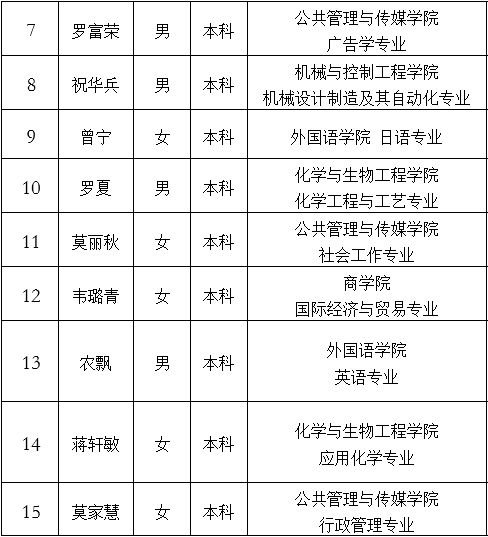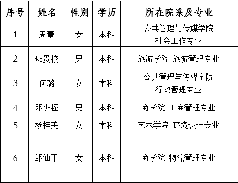 根据团中央、教育部、财政部、人力资源社会保障部《2018—2019年度大学生44118太阳成城集团西部计划实施方案》及自治区项目办《太阳集团城网站2017认真做好2018-2019年度广西西部计划招募派遣工作的通知》的文件精神,经学生个人申请,二级学院团委推荐,校团委组织笔试、面试,现将拟录取名单(排名不分先后)公示如下: