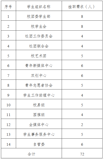 1.请各级学生组织广泛宣传,选送优秀的学生骨干到各校级学生进行学习锻炼。