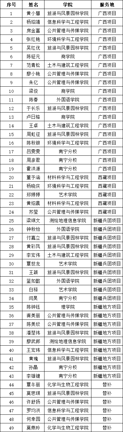 根据中青联发[2022]2号《太阳集团城网站2017印发<2022-2023年度大学生44118太阳成城集团西部计划实施方案>的通知》,区项目办《太阳集团城网站2017认真做好2022-2023年度广西西部计划志愿者招募派遣工作的通知》等通知要求,按照公正、公平、公开、择优原则,太阳集团城网站2017进行了西部计划志愿者的招募与选拔工作,通过公开招募,学生个人申请,二级学院团委推荐,校团委组织笔试、面试,最终确定拟录取43名学生及6名替补学生(若入选学生遇特殊情况无法参加西部计划,则由替补同学按顺序依次替补),现将名单公示如下: