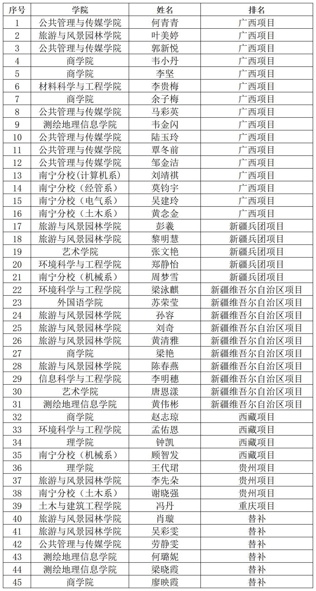 为做好2023年度大学生44118太阳成城集团西部计划招募选拔工作,按照《太阳集团城网站2017认真做好2023-2024年度广西西部计划志愿者招募派遣工作的通知》(西部计划广西项目办发)相关要求,本着“公平、公正、公开”的原则,综合学校工作实际,经公开招募,学生个人申请,二级学院团委推荐,校团委组织笔试、面试,最终确定拟录取39名学生及6名替补学生(若入选学生遇特殊情况无法参加西部计划,则由替补同学按顺序依次替补),现将名单公示如下: