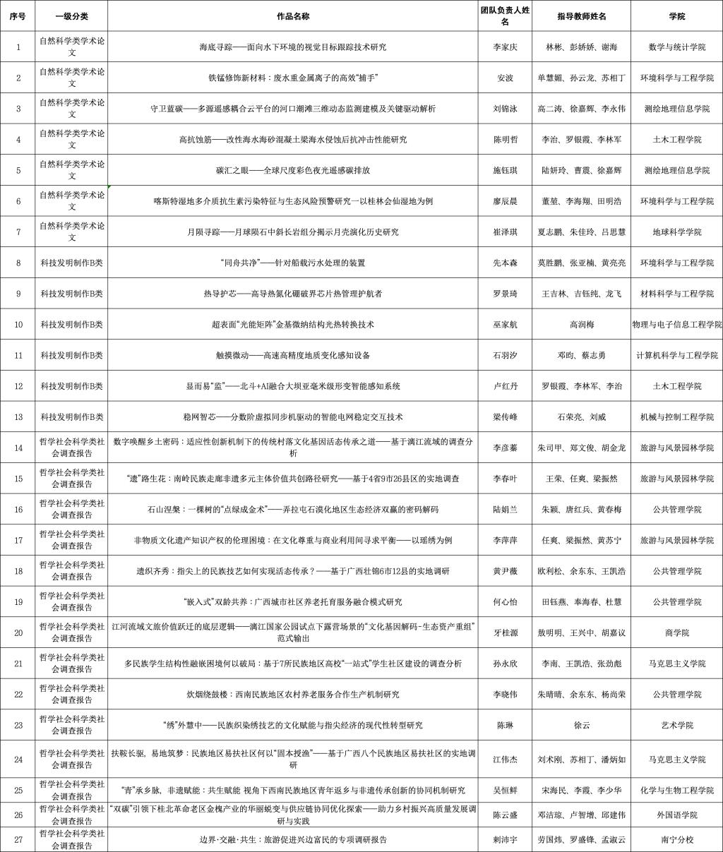 根据共青团广西区委、自治区教育厅、自治区科协、广西学联《太阳集团城网站2017组织开展第十二届“挑战杯”广西大学生课外学术科技作品竞赛的预通知》要求,经学生自主申报、学院初评、校级决赛等环节,秉承公平公正公开原则,现拟推荐27个作品参加第十二届“挑战杯”广西大学生课外学术科技作品竞赛主体赛,作品公示如下。